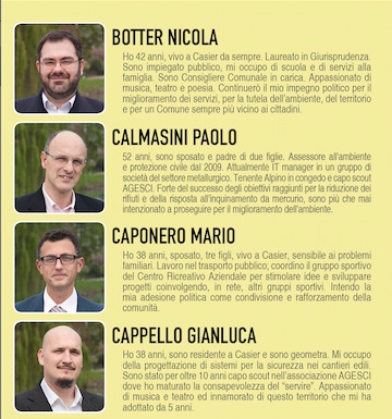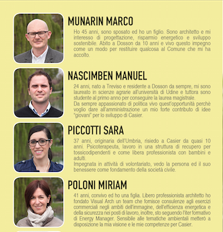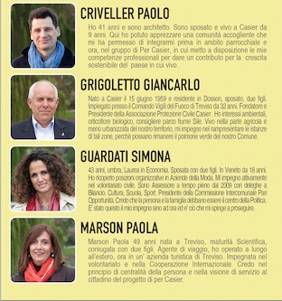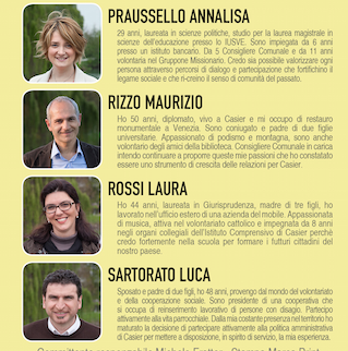 La squadra di PER CASIER coesa, affiatata, che sa cogliere e valorizzare le risorse del suo paese, sempre presente nel territorio con la sua esperienza amministrativa ed ora profondamente rinnovata dalla partecipazione e dall’entusiamo di persone con professionalità competenza disposte ad impegnarsi ESCLUSIVAMENTE per l’interesse pubblico e il bene commune.